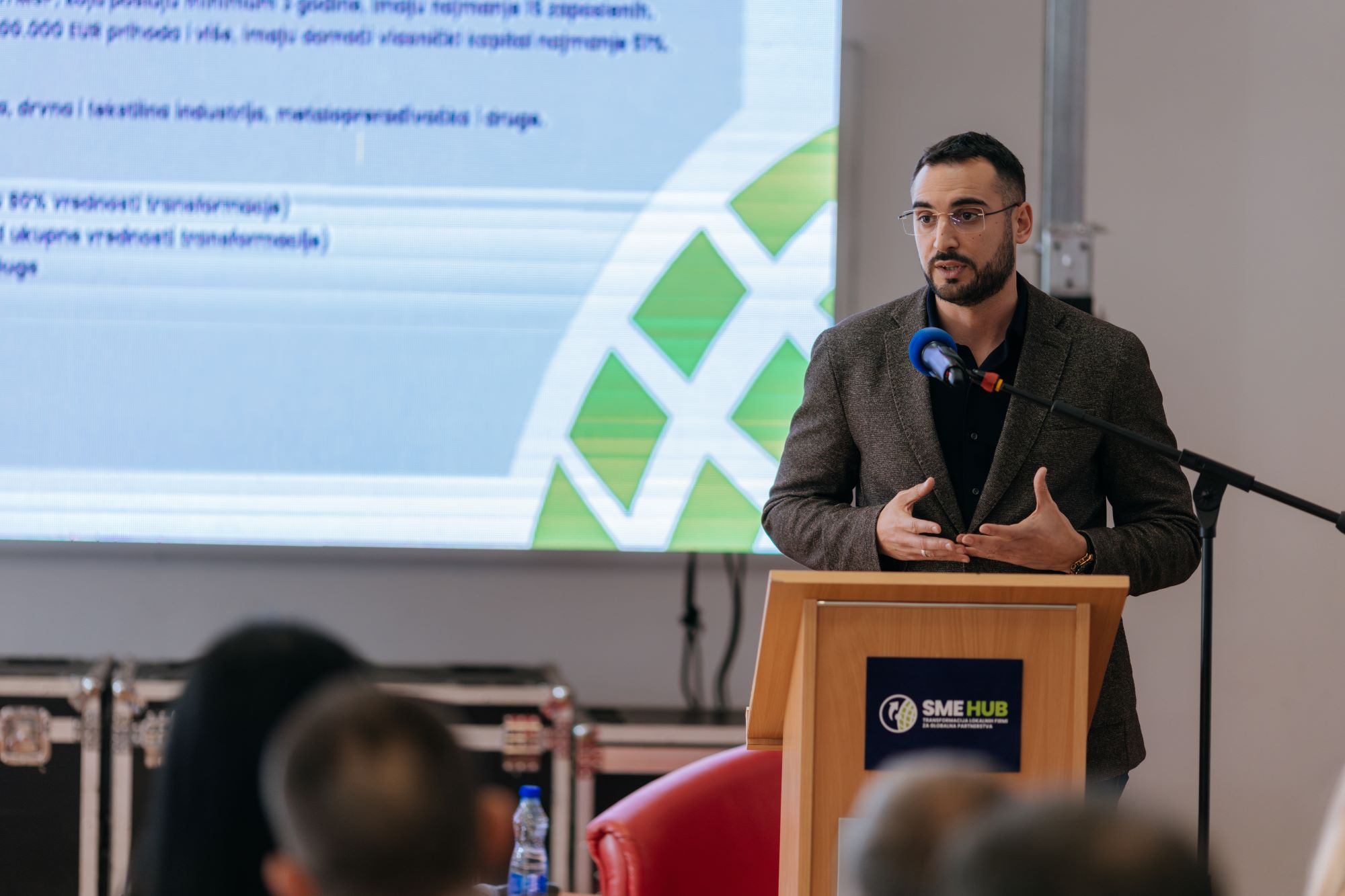 ”SME HUB pruža bespovratna sredstva za biznis transformaciju u vrednosti maksimum do 100.000 evra za dobijanje neophodnih sertifikata, licenci, ERP, profesionalizaciju menadžmenta, izgradnju sistema, reorganizaciju firme, upravljanje finansijama, tokovima novca, ljudskim resursima, prodajom, bezbednost i zaštitu na radu, ESG…”, rekao je Goračinov i dodao da sve firme koje posluju minimum 3 godine, imaju najmanje 15 zaposlenih, ostvaruju 200 hiljada evra prihoda godišnje i više i da imaju domaći vlasnički kaptial najmanje 51 odsto.